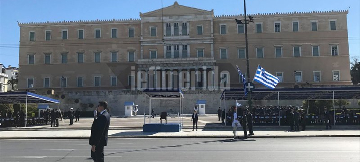Η μπάντα του ΠΝ πήρε θέση πίσω από την εξέδρα των επισήμων, στον χώρο μπροστά από το μνημείο του Αγνώστου Στρατιώτη όπου σε λίγα λεπτά θα κατατεθεί στεφάνι από τον Πρόεδρο της Δημοκρατίας, Προκοπή Παυλόπουλο, πριν την έναρξη της παρέλασης.